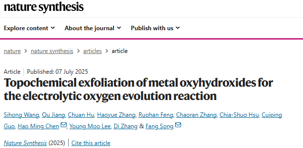 7月7日,色情小说 ,金属基复合材料全国重点实验室张荻院士团队、宋钫(国家高层次人才)课题组与中国台湾大学陈浩铭团队、韩国汉阳大学Young Moo Lee院士团队合作,在超薄二维纳米片的合成与电催化应用研究领域取得重要突破。研究成果以“Topochemical exfoliation of metal oxyhydroxides for the electrolytic oxygen evolution reaction”为题,发表在Nature子刊Nature Synthesis上。